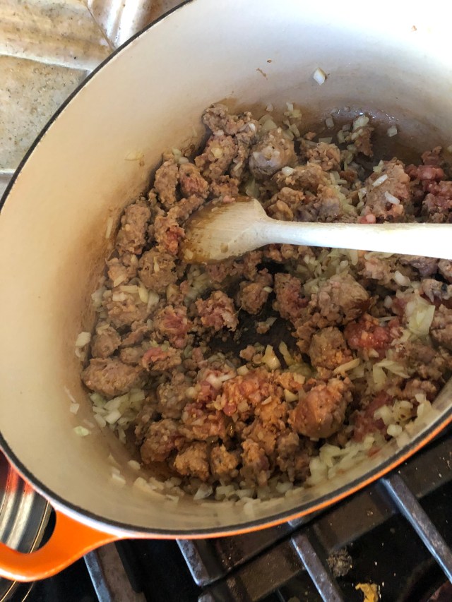 In same pan brown the sausage. Season with salt and pepper and oregano. Try to break it up into the smallest pieces you can. Sometimes I have to take it out and chop it and throw it back in.