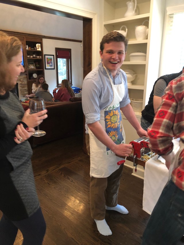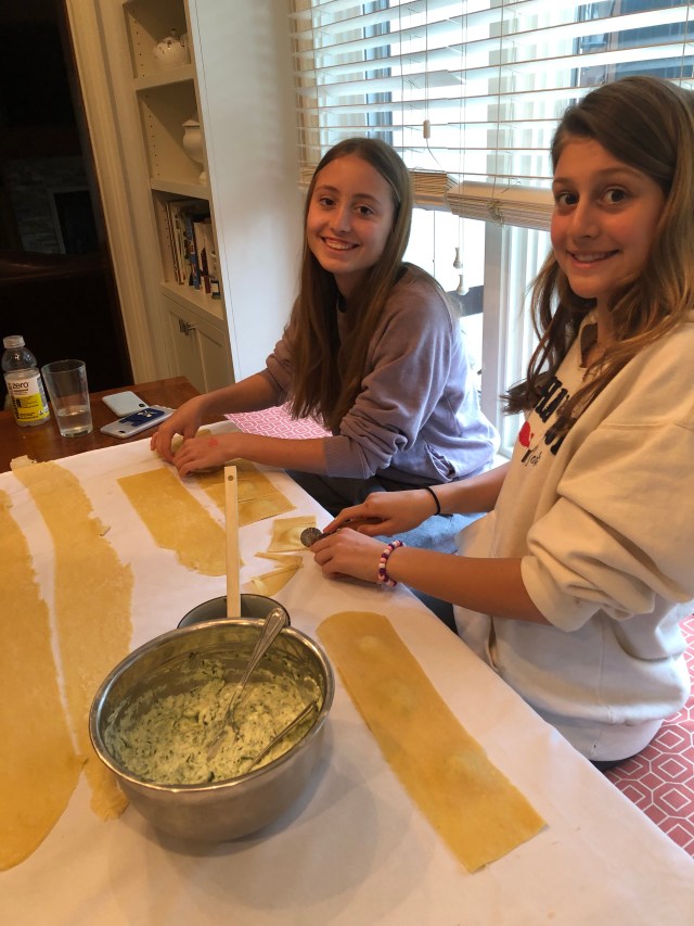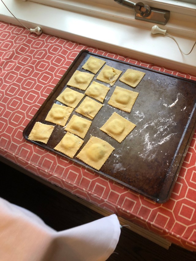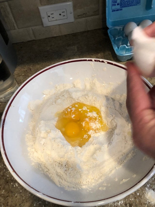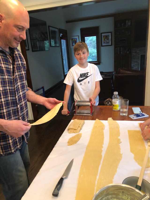 Parpadelle is a thicker pasta so we hand cut it after the pasta is rolled out. So make the dough, roll it out through your pasta machine. On our machine we rolled it out to the 8th setting. Then hand cut it into 1 1/2 inch width. Remember to lightly dust with flour so it doesn’t stick together after being cut.